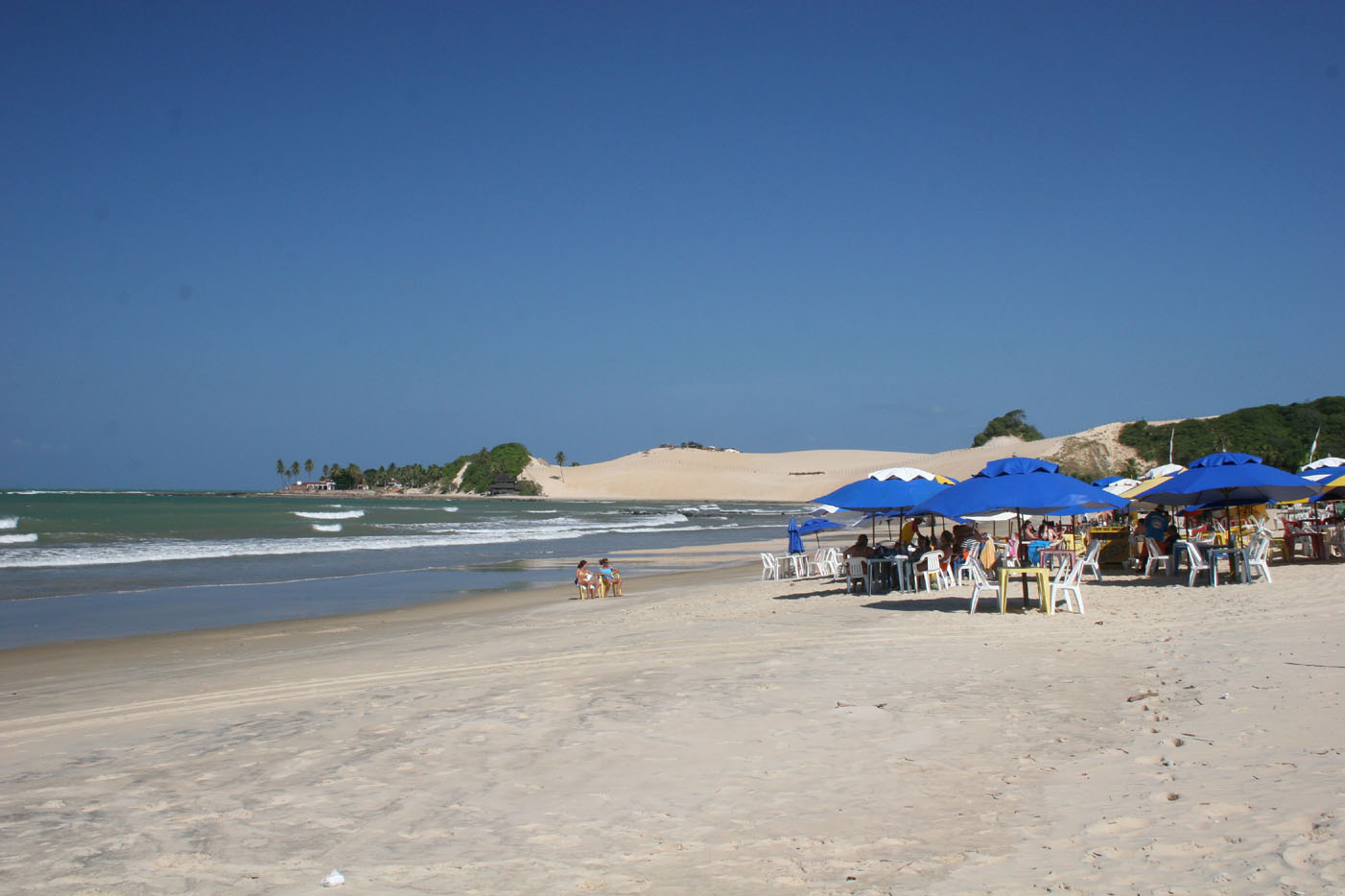 Beautiful beaches are Natal's biggest attraction. Here the beach of Genipabu. As usual, a beach bar occupies the best spot. Local tourists love buggy tours through the dunes in the background.
