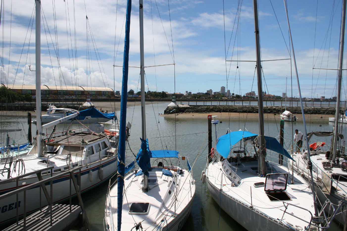 The marina basin of Cabanga Iate Club. The water does not only look suspicious but also smells a bit. In the background, you see the channel at low tide. See here for our cruising notes for Recife and Cabanga Iate Clube de Pernambuco. |