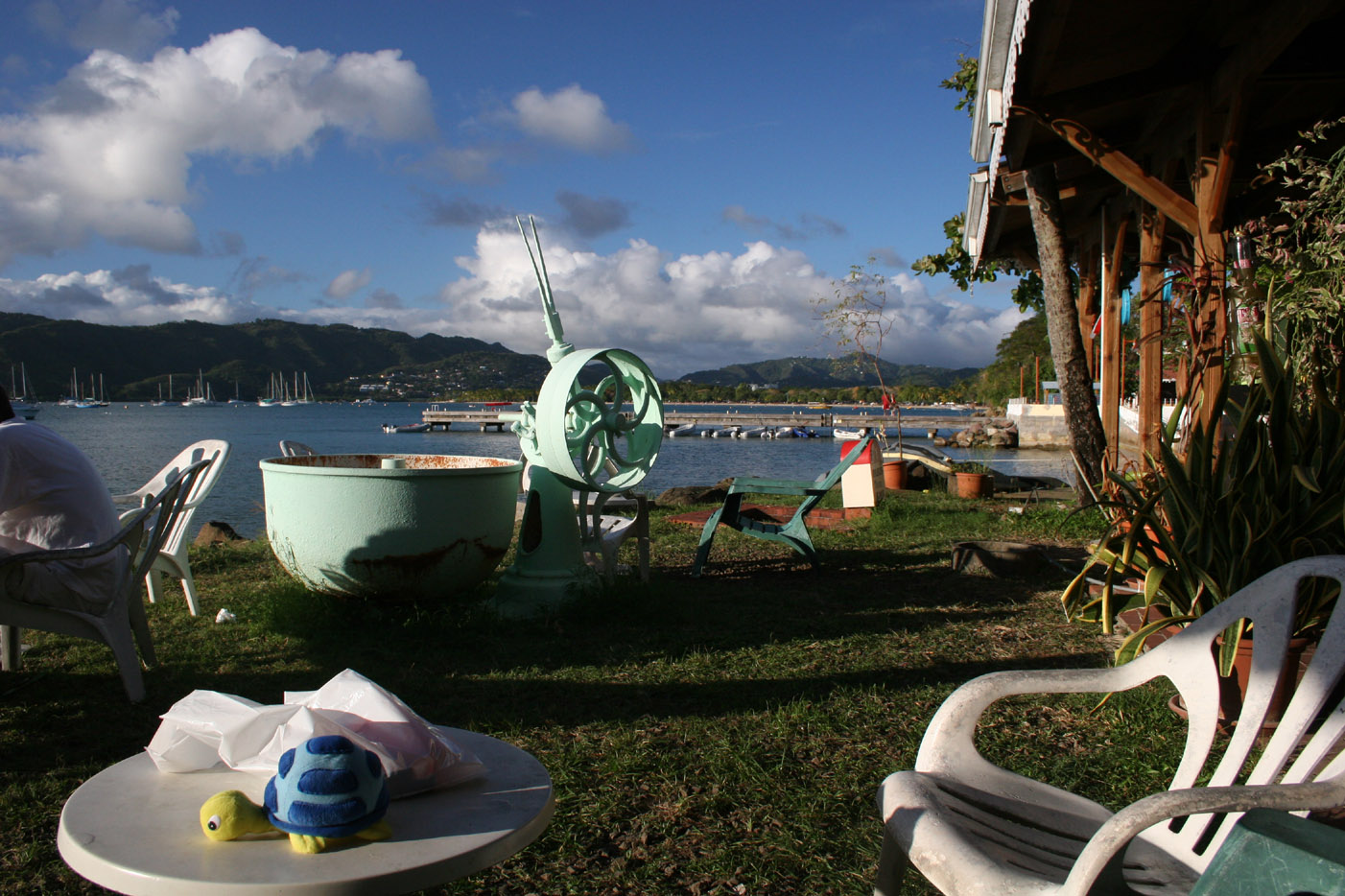 Sundowner Time in St-Anne. Yachties have good reason to be happy: the dry tourists who booked their holiday in the Club Med (the white beach in the background) were sent home because of a strike.