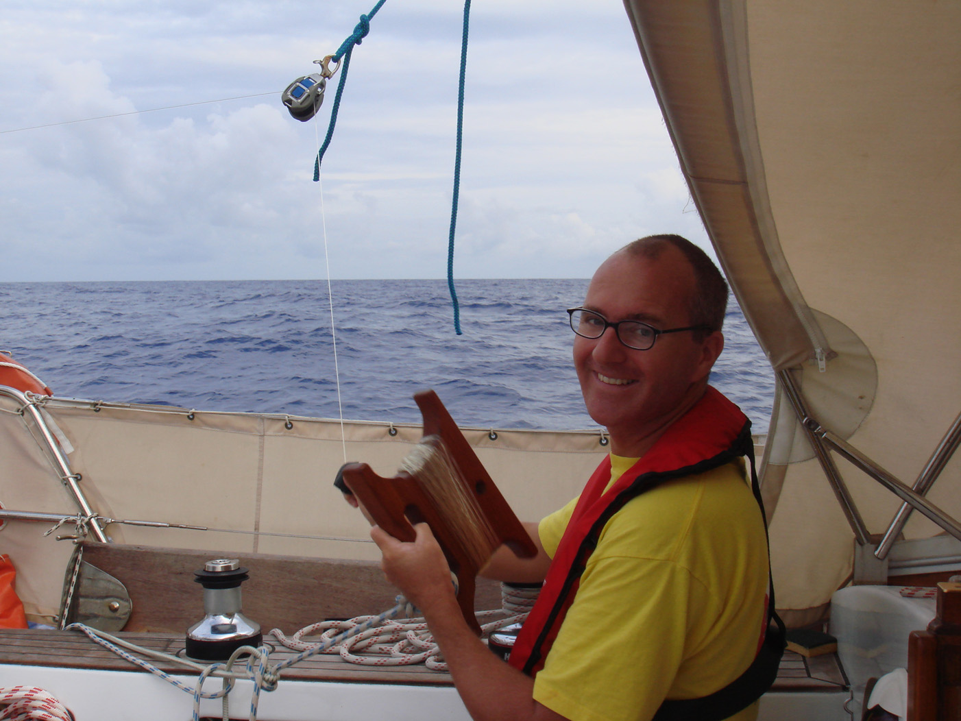 Benno is happy because he has a fish on the line. Note the ingenious solution with the snapshackle on the boom to bring in the beast. Once the killing behind us (and the cockpit cleaned), the fish ends up as sashimi, grilled fish, fish curry, fish in lemon-ginger-marinade or fish nuggets.