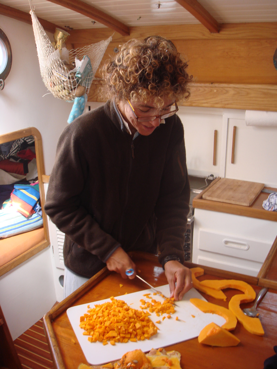 For most of the trip we had fresh vegetables. Here, Alexa cuts the last pumpkin for her delicious soup, four days before our arrival in Cascais.