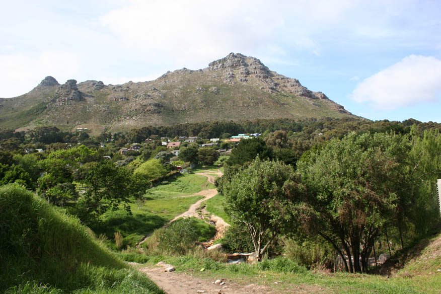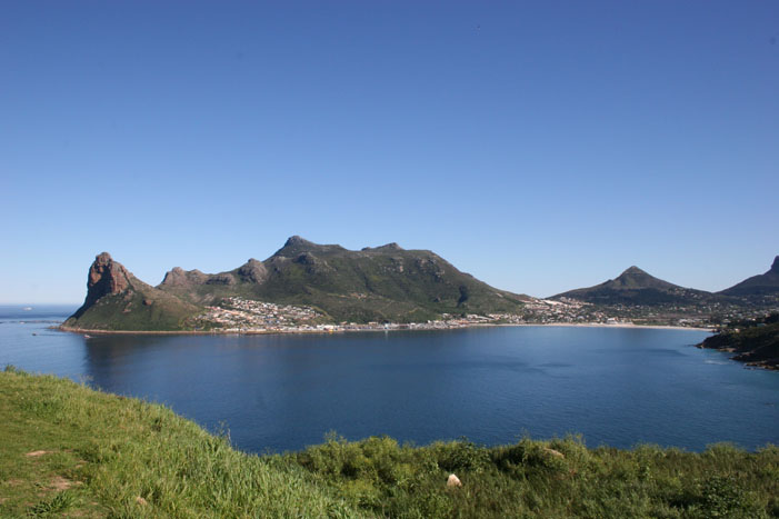 The photo shows Hout Bay as seen from Chapman's Peak drive. You will find the following in Hout Bay: a long beach, mountains (including the back of Table Mountain), Whales, a few seals in the harbour, hundreds of seals on Seal Island, dunes, a fisheries harbour, many restaurants (even an Austrian restaurant), four supermarkets, Mandela Park, japanese Tourists, French Tourists, Swiss Tourists, emigrants from all over the world and a naked bathing beach.