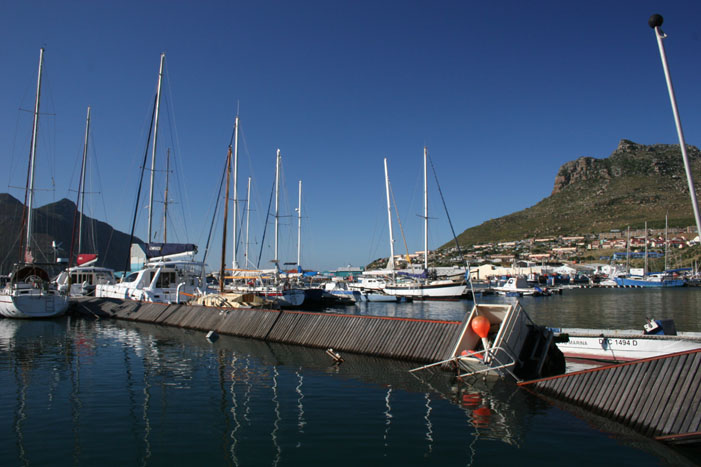 You can get strong winds in Hout Bay. When the South-Easterly turns East, it generally gets ugly. This happened mid November. Gusts reached 70 knots (12 Beaufort, hurrican). Part of the marina swam belly side up, a boat was dismated and another one crushed.