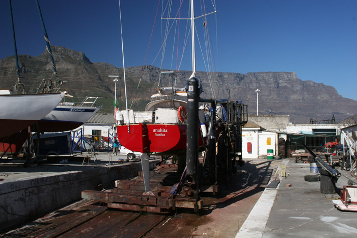 After two months in Saldanha Bay, we came back to Hout Bay for repairs and completion work. Finally, we sailed on to Cape Town. In the Royal Cape Yacht Club we took Anahita out of the water, re-did the antifouling, and had some other jobs done in order to get ready for the Atlantic crossing.