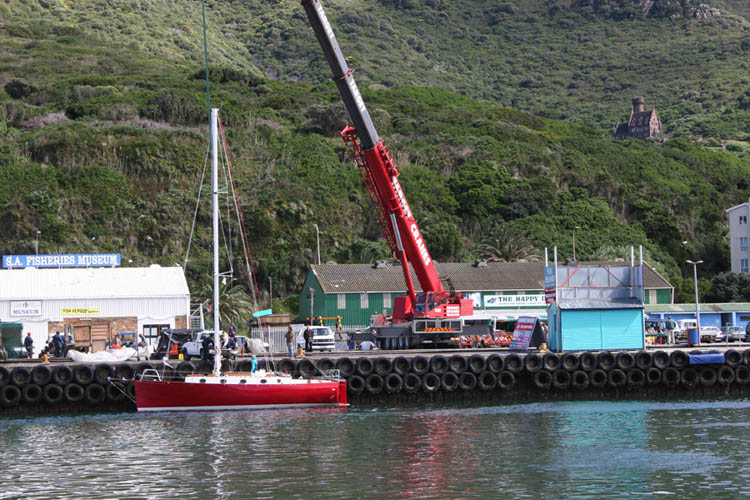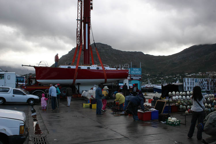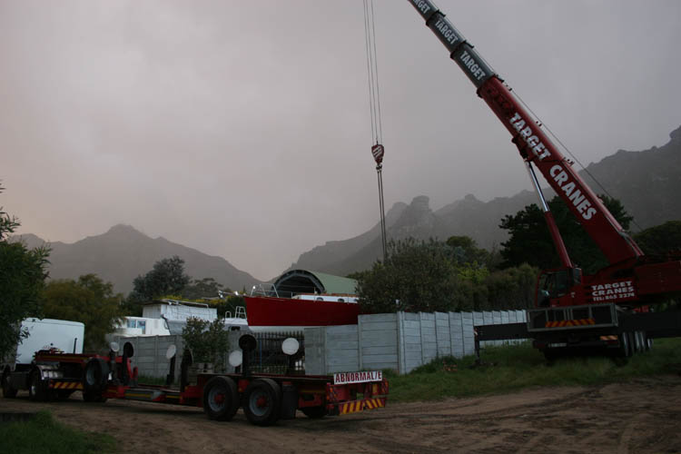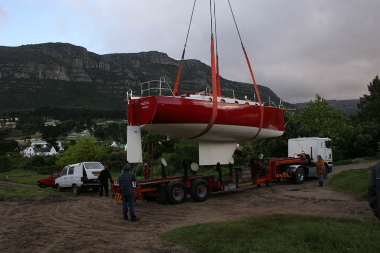 5 October 2005: The day we've been looking forward to for three years: Anahita is going to float today. It is freezing cold and it rains heavily. Benno is unimpressed. At 6 a.m. he takes his bike and cycles down the road of death to the yard. The crane is already waiting. Between two hefty showers, Anahita is lifted into the air, gets a bit of antifouling under the keel, and sits down on the lorry.