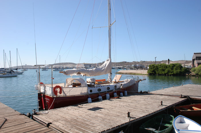 Anahita moored on the jetty of the Saldanha Bay Yacht Club. The jetty is supposed to be used for short stays only; normally, we are on one of the swing moorings in the background. When South Westerly winds create swell in the lagoon, we move to one of the moorings of the Small Craft Harbor, just around the corner.