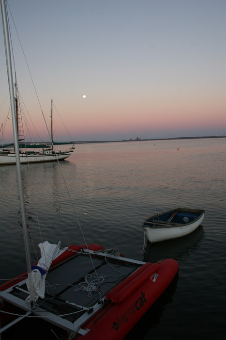 Typical view at sunset: our inflatable catamaran (imported from Austria) and the dinghi, our neighbor "Elegance", and, far in the background, the industrial complex of Saldanha Steel.